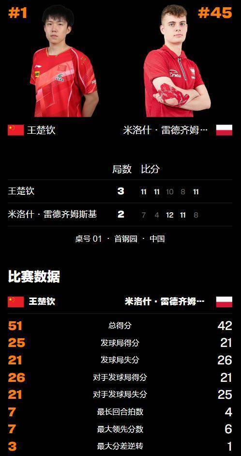 在上个月结果的WTT澳门冠军赛上宁波市泰乐村娱乐管理有限公司,王楚钦在队友发达欠安的情况下,连克劲敌问鼎男单冠军,匡助国乒完毕了融会两站顶级大赛莫得站上男单冠军领奖台的难过处境,赢得2000积分的大头,也遂愿非凡了队友林诗栋,重返天下名次序一的宝座,稍作休整的王楚钦,又奴婢国乒迎来了WTT中国大满贯的征途,正赛第4日,大头在男单1/16决赛对阵波兰选手米洛什·雷德皆姆斯基。