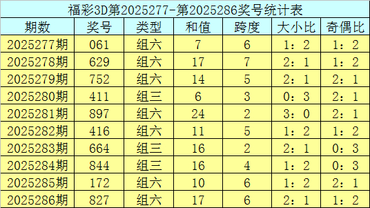 开奖总结:福彩3D第2025286期奖号:827。