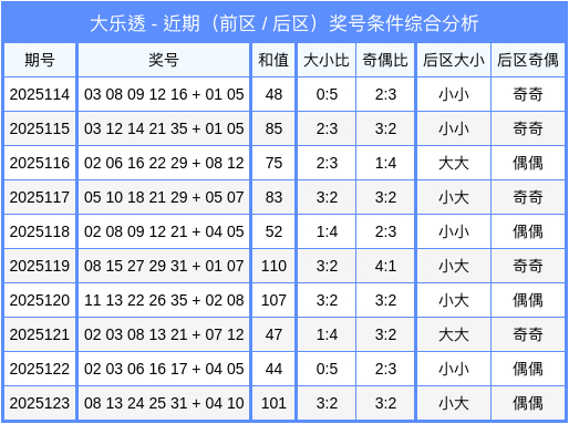 后区大小分析:最近10期大小比为8:12,大小走势为:小小-小小-大大-小大-小小-小大-小大-大大-小小-小大,本期贯注蓝球开出【大大】组合号码。
