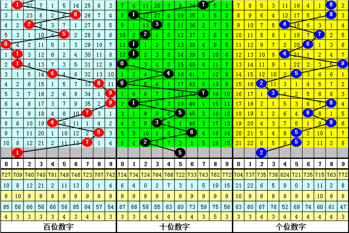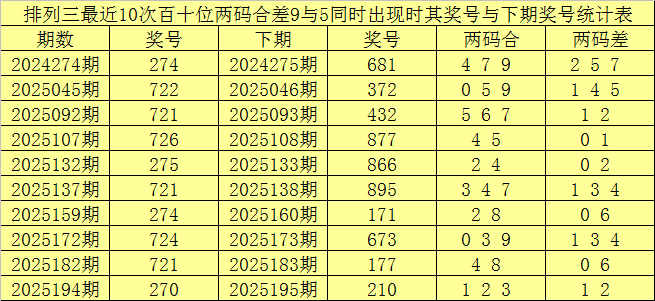 从以上统计不错看出,百十位两码合差9与5同期出现之后其下期两码合差施展最热的4个分裂为:0124,本期百十位两码合差不错参考这四码中的数据。