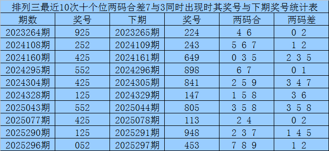 十个位合差分析:上期奖号十个位开出25组合,两码合为7,两码差为3,最近10次十个位两码合7与两码差3同期出刻下,其奖号和下期奖号分裂为: