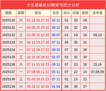 开奖总结:大乐透第2025139奖号:08、18、22、30、35+01、04。其中奇偶比为1:4,大小比为4:1,和值为113。