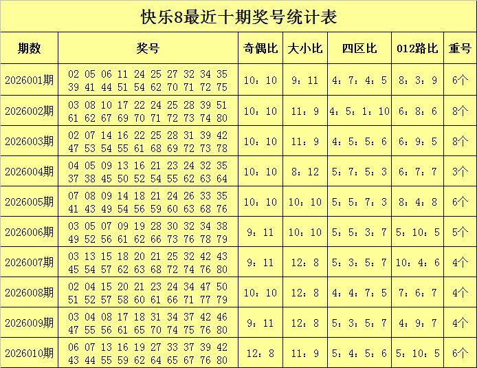 福彩欢乐8第2026010期开奖转头:06 07 13 16 19 27 33 37 39 42 43 44 55 59 62 64 65 67 76 80宁波市泰乐村娱乐管理有限公司,其中奖号奇偶比为12:8,大小比为11:9,四区比为5:4:5:6,012路比为5:10:5,重号6个:37、42、55、65、76、80。