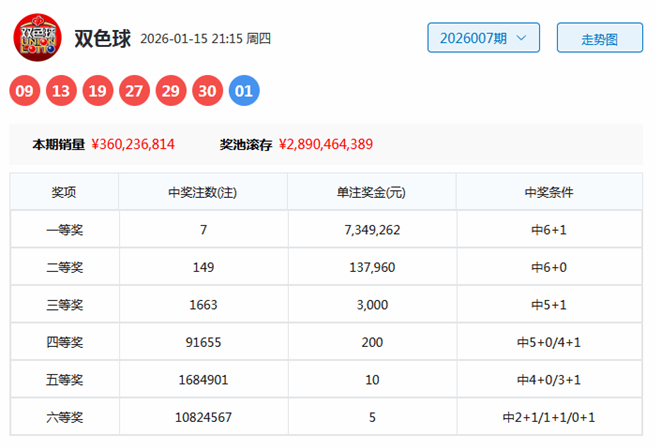 开奖总结:第2026007期双色球奖号为09、13、19、27、29、30+01。区间比:1:2:3,奇偶比:5:1宁波市泰乐村娱乐管理有限公司,首尾间距:21。